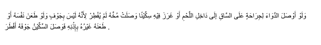 Artinya: “Jika dia memasukkan obat karena luka pada betis ke dalam daging, atau menusukkan pisau ke dalamnya hingga sampai ke sumsum, maka tidak batal puasanya, karena itu bukan rongga badan. Jika dia menusuk dirinya sendiri, atau ada orang lain yang menusuknya atas seizinnya, dan pisaunya ditancapkan sampai pada bagian rongga dalam perut, maka hal itu membatalkan puasa.” (Syihabuddin Ahmad al Qalyubi, Hasyiyah Qalyubi wa Umairah [Mesir: Dar I?ya’il Kutub al-Arabiyah: 1950] Juz II, Halaman 56).