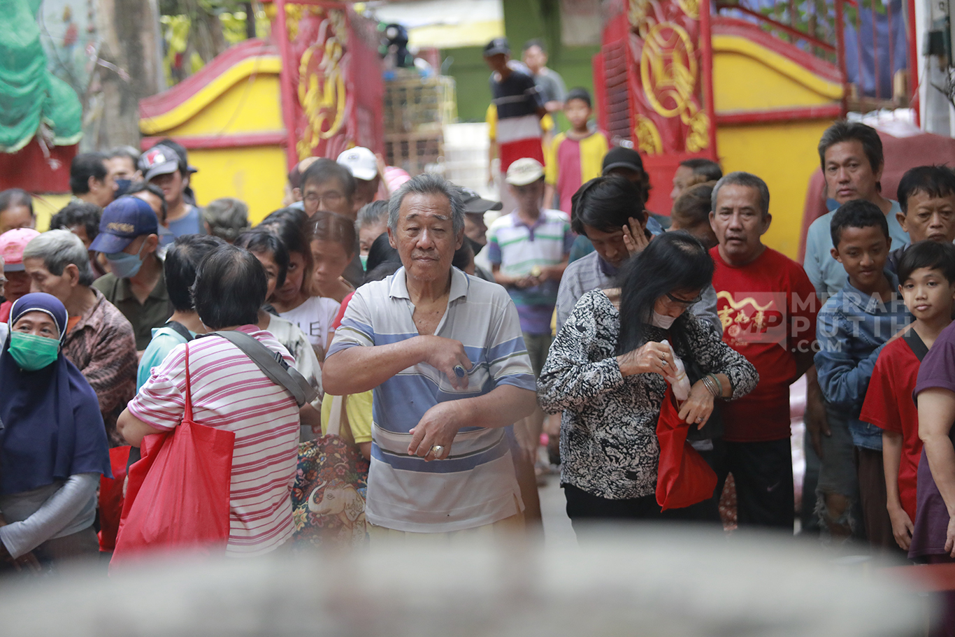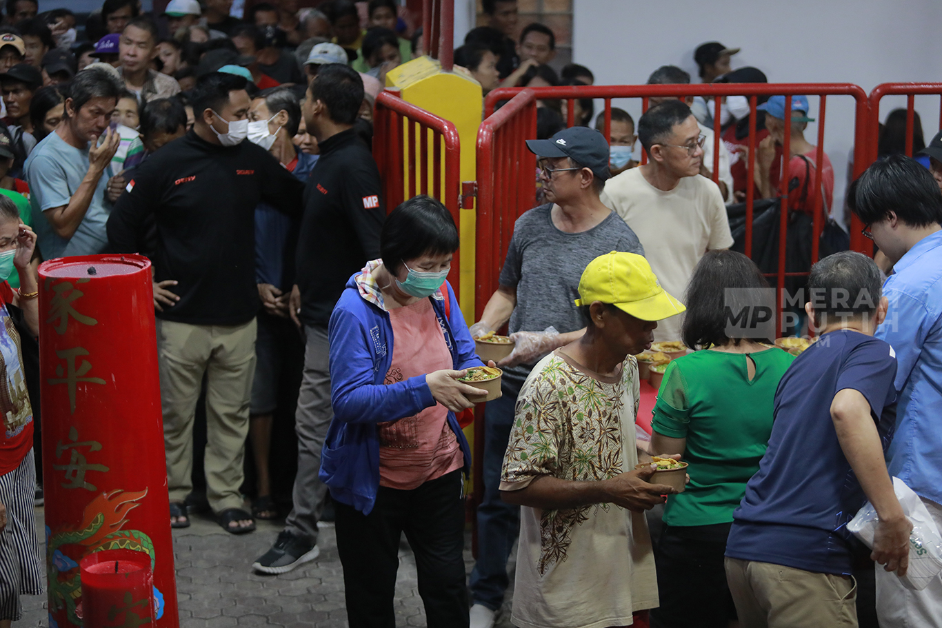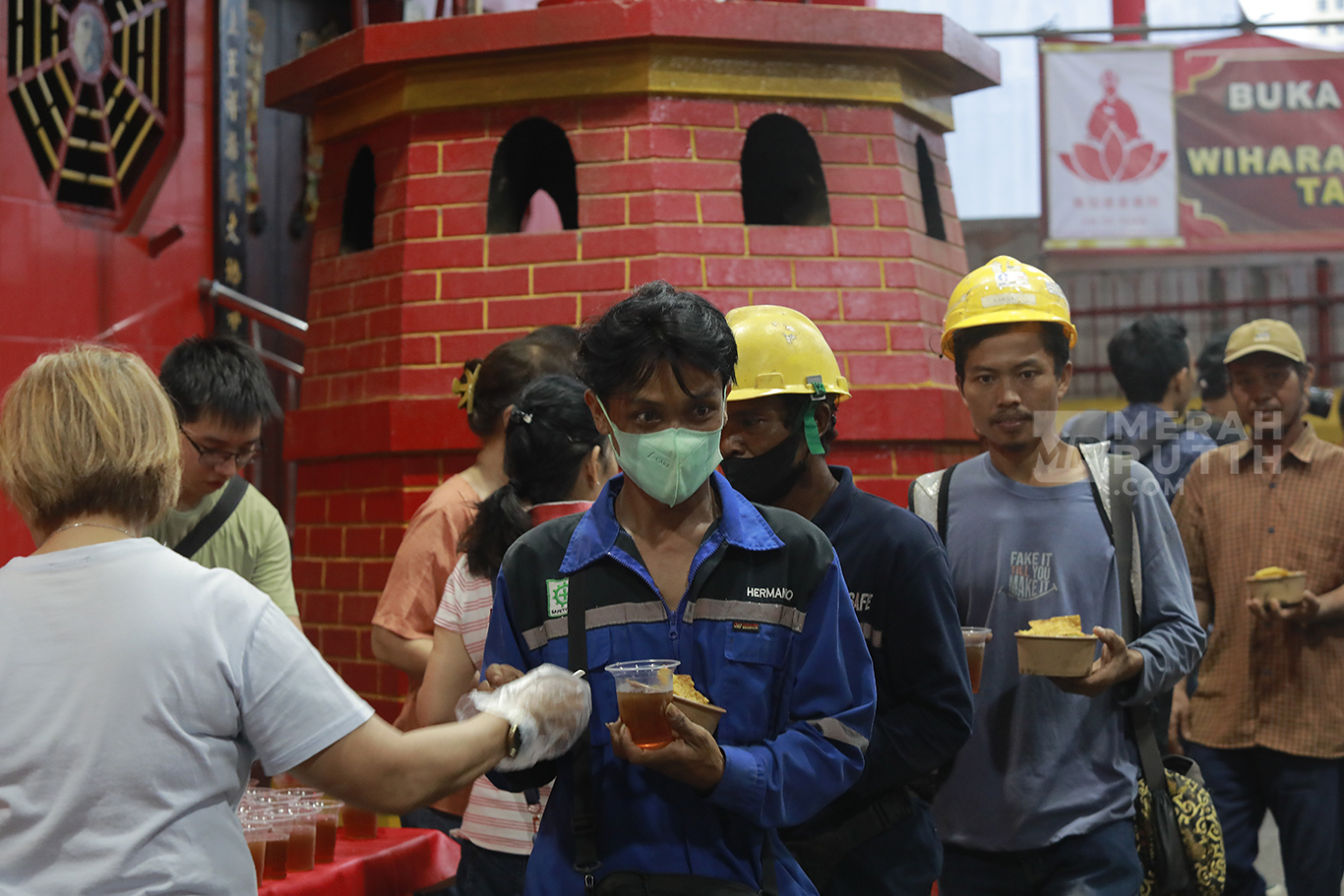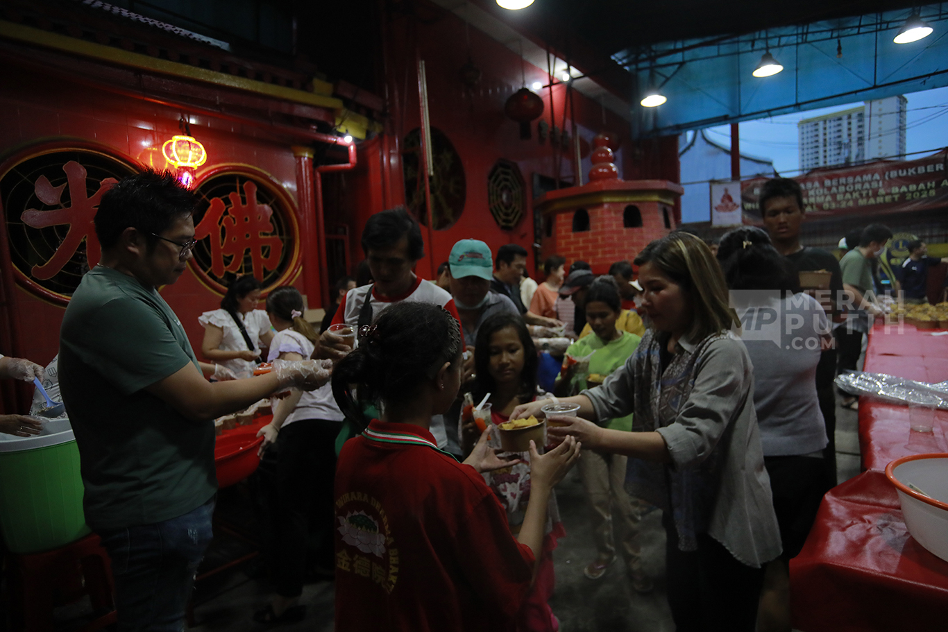 Merahputih.com - Umat membagikan makanan untuk buka puasa bagi umat muslim di Vihara Dharma Bakti, Petak Sembilan, Jakarta Barat, Senin (10/3/2025).